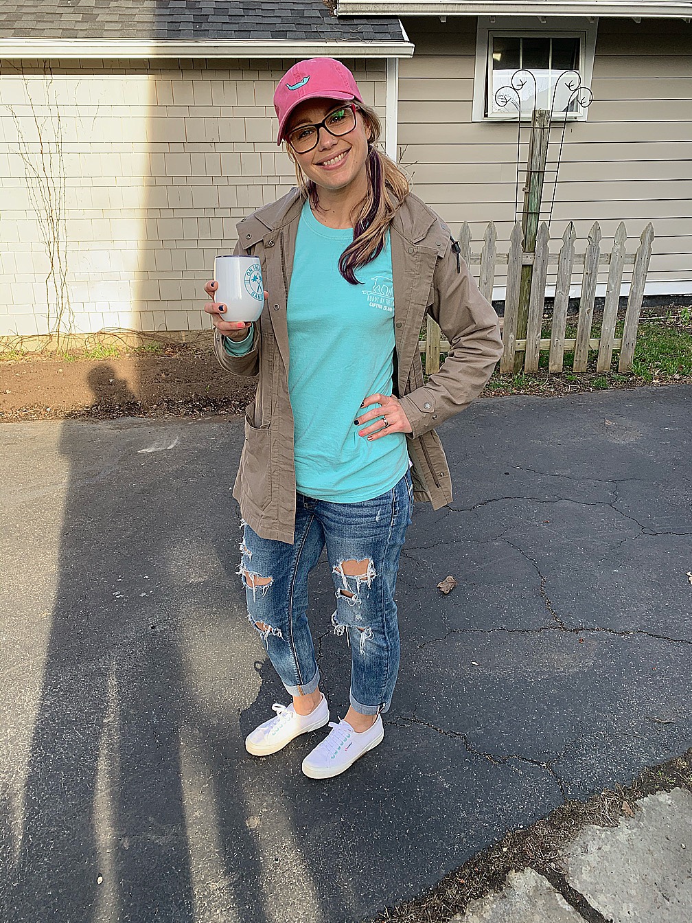 We had a BEAUTIFUL day here today, and we made the most of it with a quick playdate with Maya, a run with Adam, and then a walk to the Nyes’ for dinner. I pulled out all the stops with my Florida-themed attire and traveling wine tumbler!