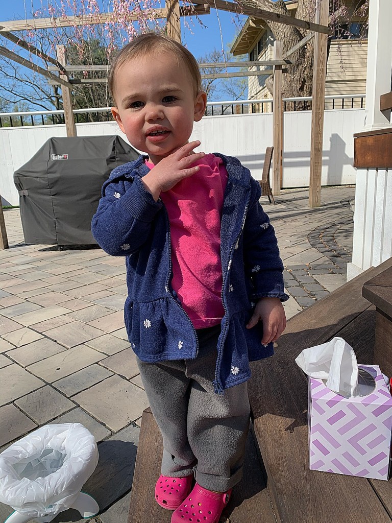 So, the following day, I backed off a little and didn’t try to physically move her to the potty–I utilized the ‘red solo cup’ trick described in the book (and Jen’s course) and that seemed to keep her a bit more calm. We also GOT OUTSIDE (something the course recommends even if you’re still technically in Block One) on a little playdate with her friend, Maya, which made us all feel a bit more normal. By the next day, something clicked and Maelle even took herself to the potty!