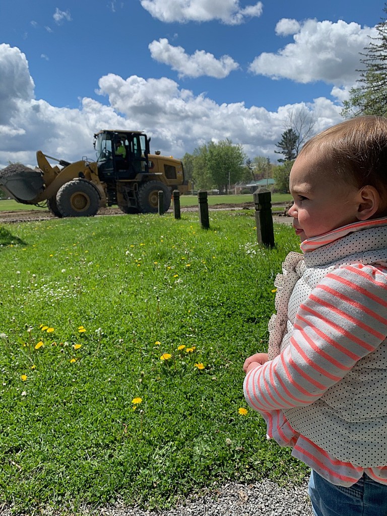Maelle discovered a newfound love of trucks! When her friend, Emmett, came to visit earlier this month, he brought a bunch of ‘boy toys,’ and Maelle took an interest. Lucky for us, our village was re-doing the running track across the street right then! So, we took a few field trips to see the excavators and dump trucks.