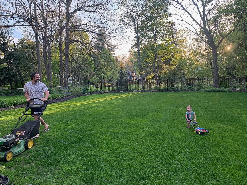 After our taxes, Andrew’s ‘break’ was mowing the lawn. At least he had a little helper…