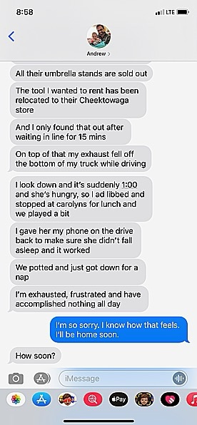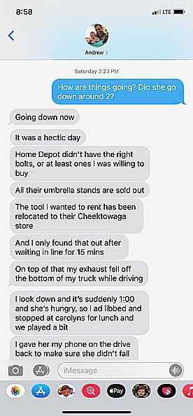 On Saturday I had a baby shower to attend, so Andrew took Maelle with him to run some errands. Around nap time, I shot him a quick text to check in. The following two images should give you all the information you need to know:
