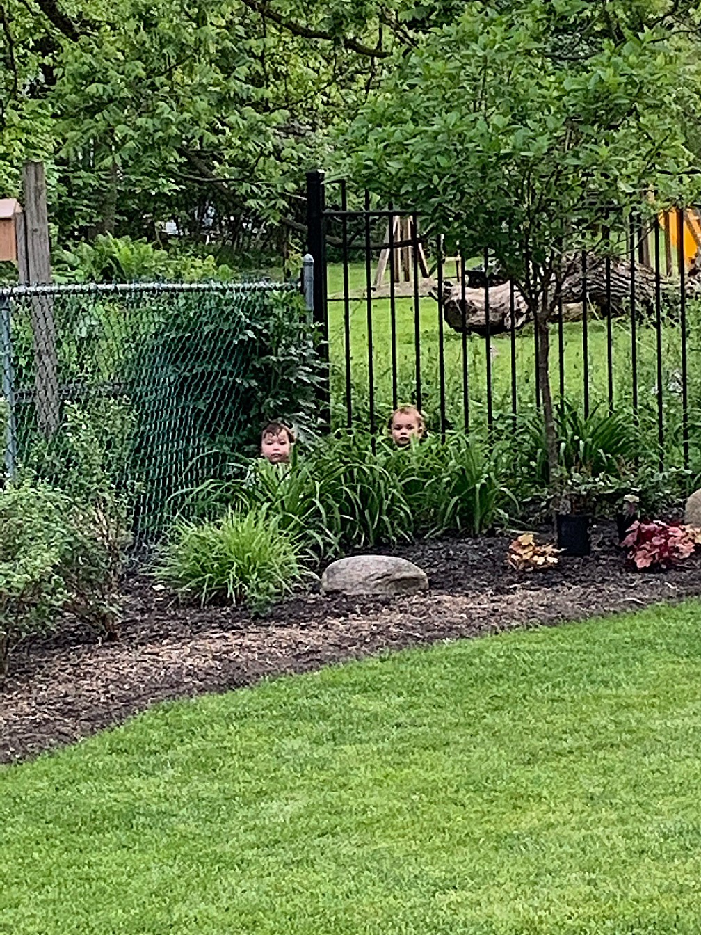 After dinner, the kids played hide-and-seek in the backyard. At least they tried to; I think only one of them was really old enough to fully understand the game! It was so cute watching the younger ones, especially Maelle and Maya, try to find hiding spots! If you look closely, in the VERY zoomed-in photo below, you can see Maelle and Maya crouching down in the very back corner of the landscaping…I can’t believe they stayed there long enough to be found! And quiet!
