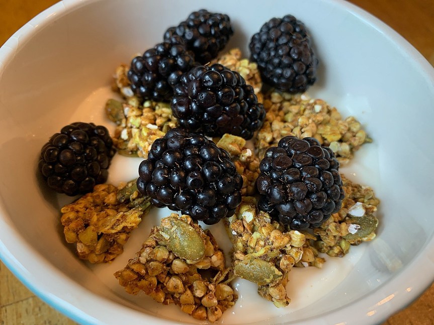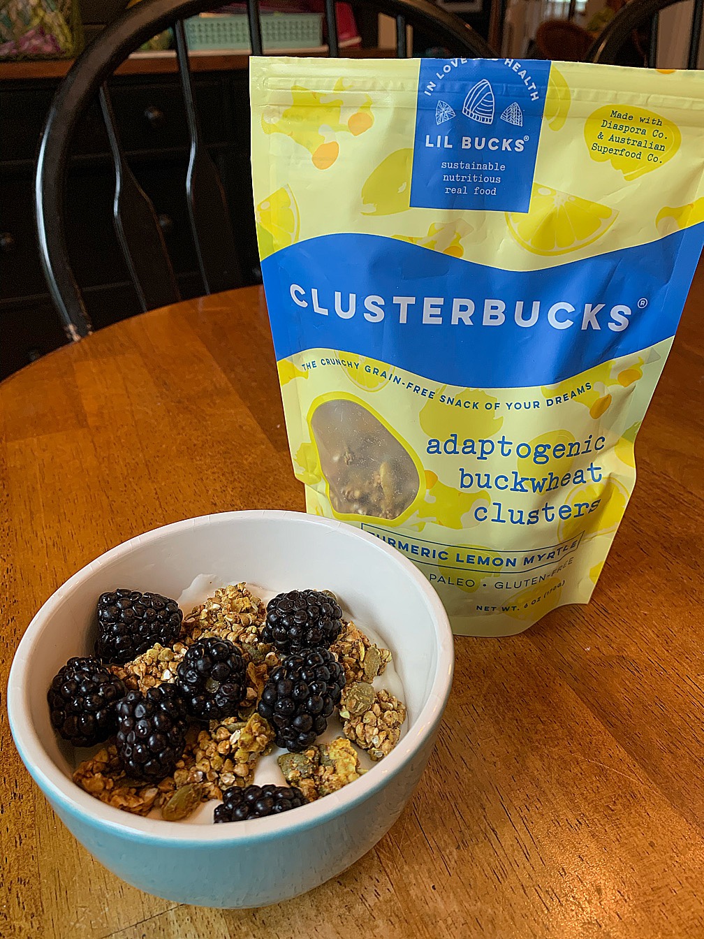 Lil Bucks has two flavors of ‘Clusterbucks,’ Tumeric Lemon Myrtle and Chocolate Reishi. I paired the tumeric with blackberries and lemon yogurt and loved every bite! The clusters had just the right crunch and had a distinct lemon flavor, in addition to a bit of a kick from the tumeric.