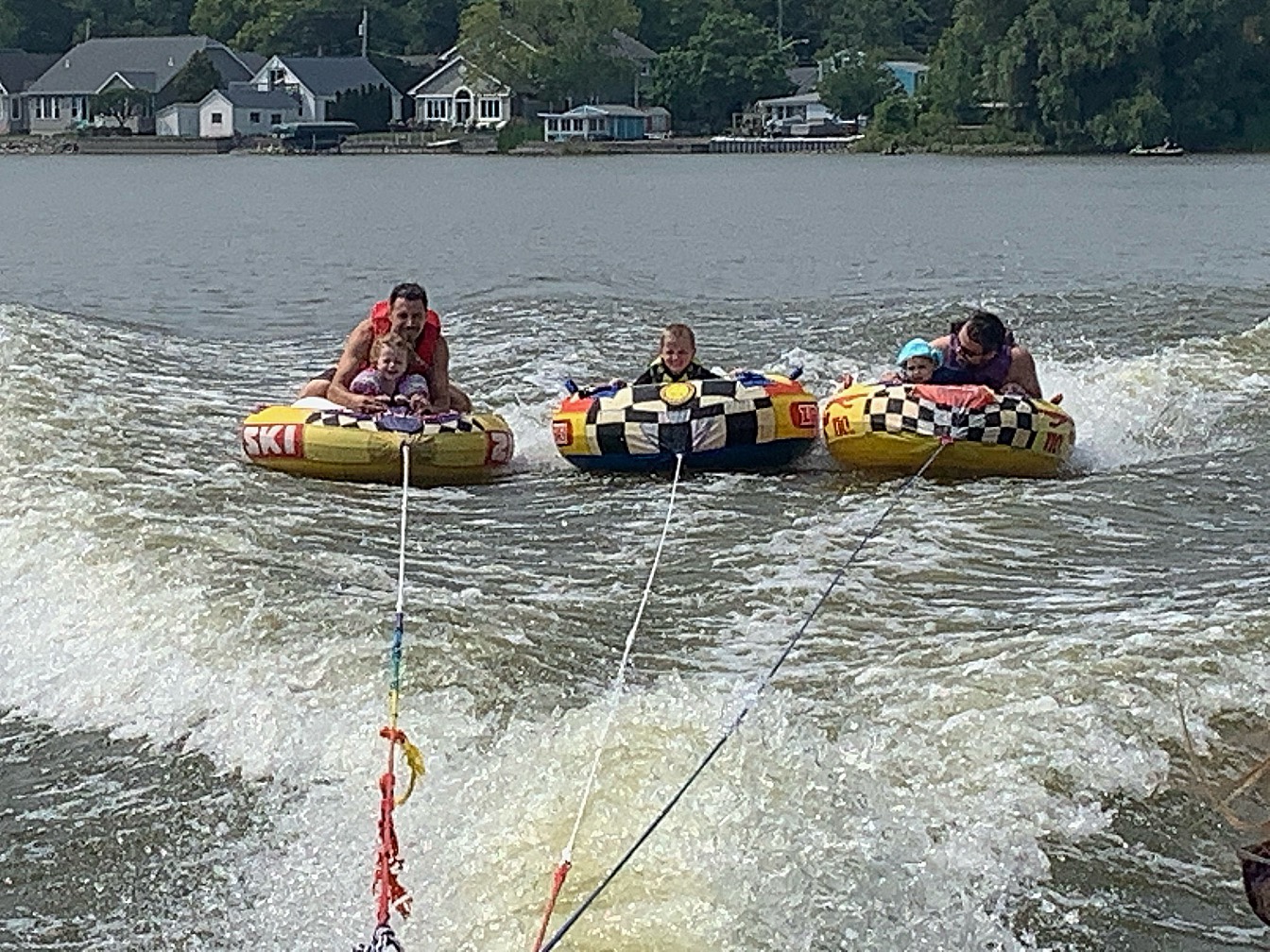 Speaking of Maelle…there she is on her first tube trip! (Right-hand tube with the blue hat.) She didn’t last long, but I was glad she was brave enough to try. The littles took turns riding before we stopped for a swim break, during which Maelle had to be held–naked–over the side of the boat to pee. Poor thing had been holding it for so long! It might be the only thing she remembers from that day…