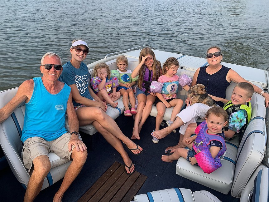 The day at Uncle Al’s typically begins with boating and lunch, followed by time spent relaxing on their deck. With all the little kids running around, I’m not sure there was a whole lot of relaxing (!!), but the good views and good company make up for it. After dinner, we all loaded up for a sunset cruise. (This is actually a ‘small’ crowd–we were missing a family of five due to illness!)