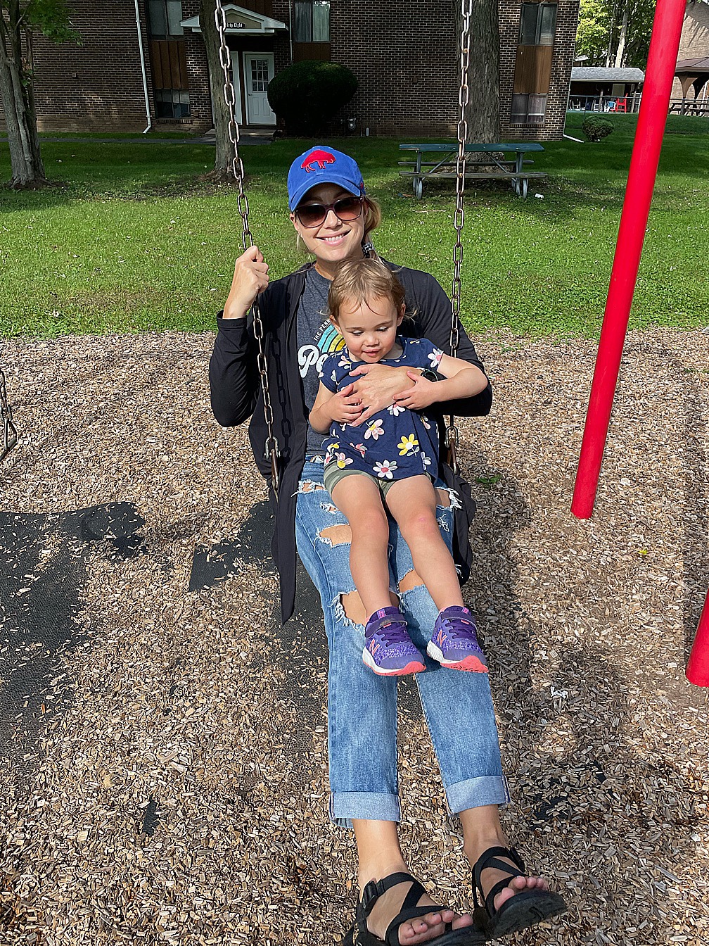 Lake Placid is an easy six-hour drive from our house, and we left mid-morning on a Thursday. We’ve started stopping at playgrounds for lunch along the way, after we had such a good experience doing that on this trip. Sometimes I pack us a lunch, and sometimes we find somewhere to purchase food. It’s a great chance for Maelle to run around and often ensures a better car nap than if we hadn’t stopped.