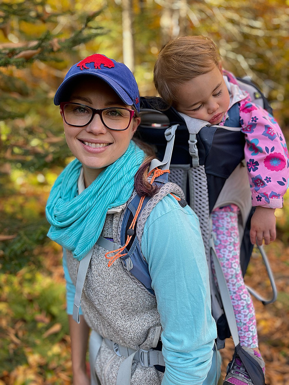 While we could have shortened our hike by exiting the northern trailhead and walking along the road to our car, we were having such a great time that we chose to turn around and retrace our steps to the southern trailhead, where we started. Along the way, Maelle fell asleep and stayed that way for at least 30 minutes! Andrew remarked multiple times that weekend about the big smile on my face. I was having a blast.