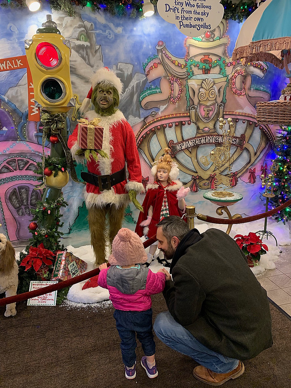 Earlier this month, we strolled Main Street to do some shopping and stopped at the Aurora Theater to see The Grinch memorabilia. Each December, the theater has all the props on display for a free showing of the movie. A local guy is a collector, and he even has the giant sleigh!