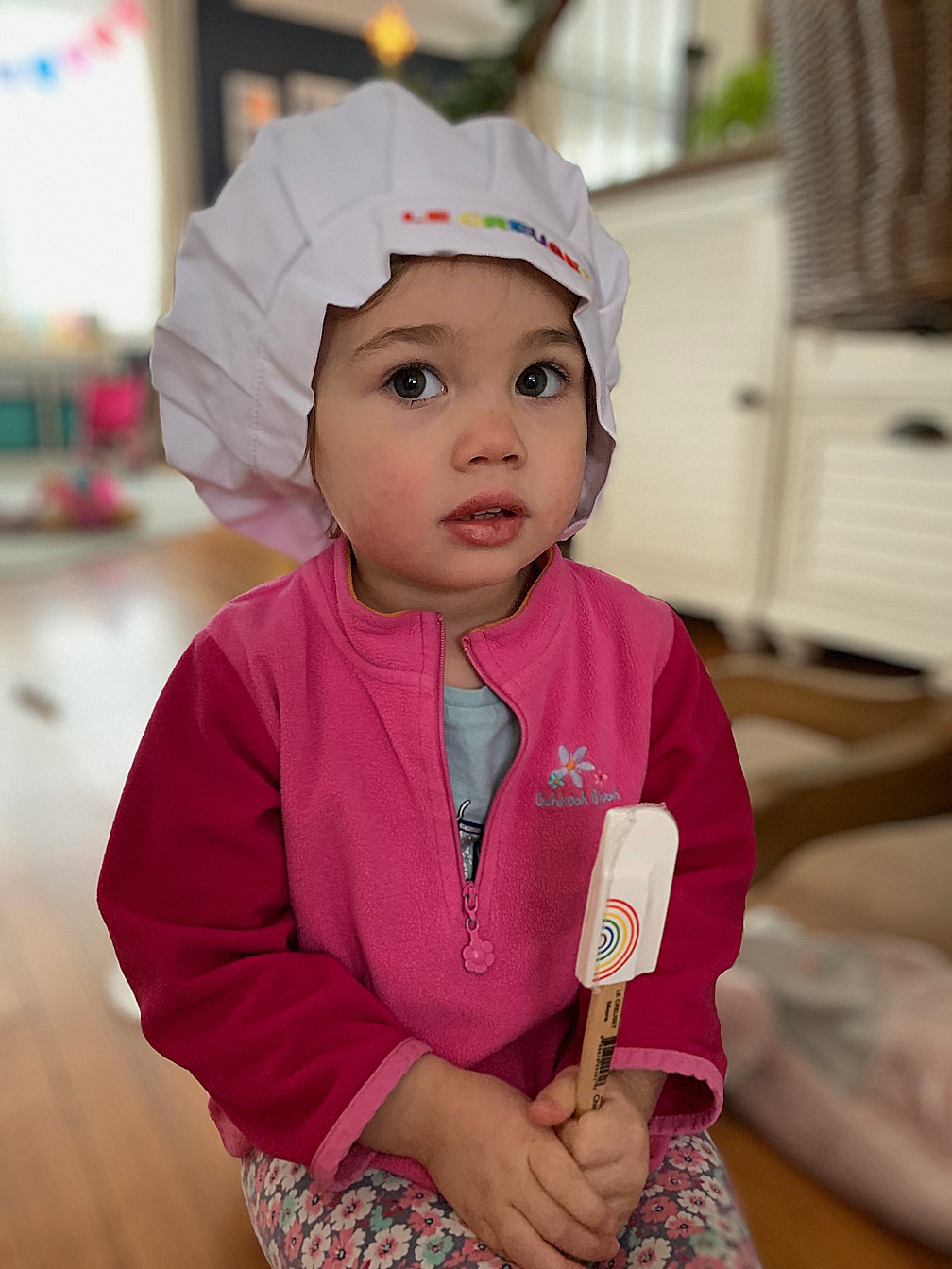 Emily talked this gift up SO MUCH, and I couldn’t believe my eyes when I opened it. It was a Le Creuset (one of my favorite brands) family baking kit, and it even included this little chef’s hat for Maelle. I about died.