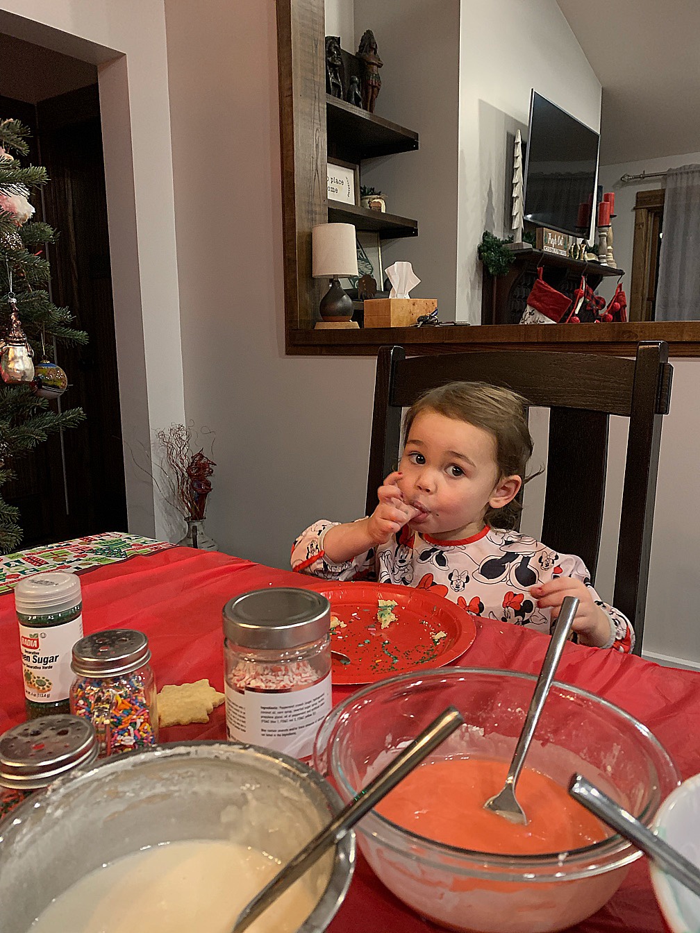 Maelle was very excited to decorate! We’ve actually done a bit of baking this month, so it was a good thing we opened our present from Emily a little early!