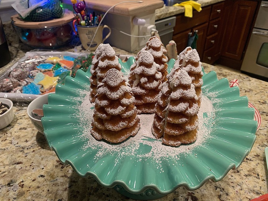 Andrew saw them in a catalog and bought the tree pans and a couple boxes of eggnog-flavored cake mix for me. It’s been fun to whip them up a few times for friends and our Christmas Eve party (above).