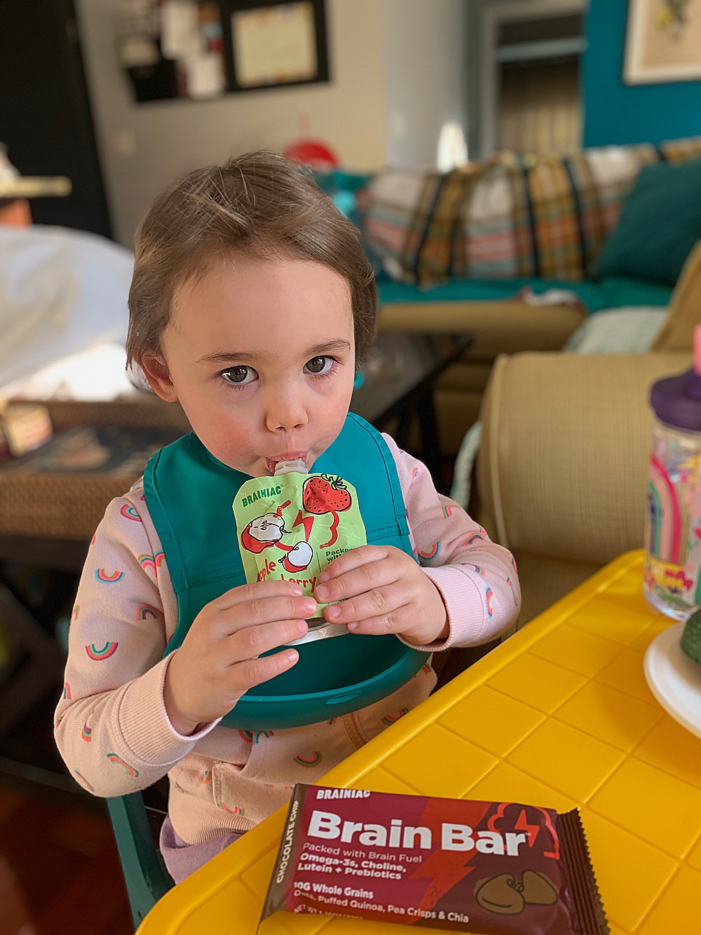 A quick word about pouches: Now that Maelle is older, I don’t offer pouches that often. In order to promote eating more ‘whole’ foods, I limit them to when we’re traveling and she has to eat in the car, or perhaps if she’s in the stroller. That being said, pouches find their way into her hands fairly often 🙂 So, when I buy pouches for her, I make sure they are packed with nutrition. That could be protein or fiber, or something like what Brainiac is doing–adding additional nutrients that can otherwise be hard to get in a toddler’s diet.