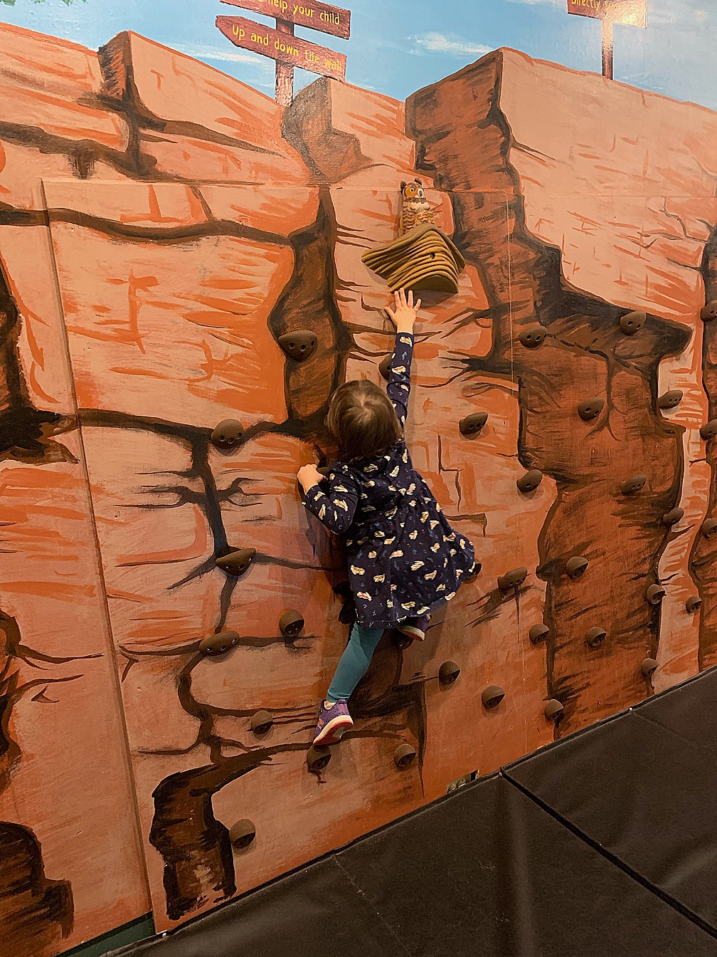Maelle used her climbing skills to reach the owl on the rock wall, while Nora enjoyed the giant ‘lite brite’ and slide in the same room.