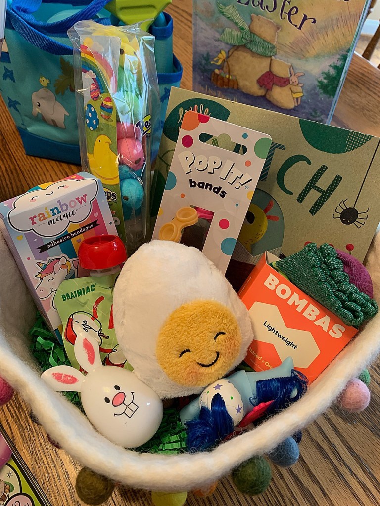 I love putting Easter baskets together. Andrew and I have been giving each other baskets since we got married, and it’s even more fun now that Maelle isn’t a baby anymore. She got a book, a hardboiled egg stuffy (!!!), mini Teleties (stashed in that white plastic egg) and some ‘thin’ Bombas socks. And, of course, fun band-aids. I gifted Andrew a pair of Bombas, too, and some white chocolate. My mom filled baskets with sugary waffles (straight from Belgium!), Peeps and Ritter Sport chocolates.