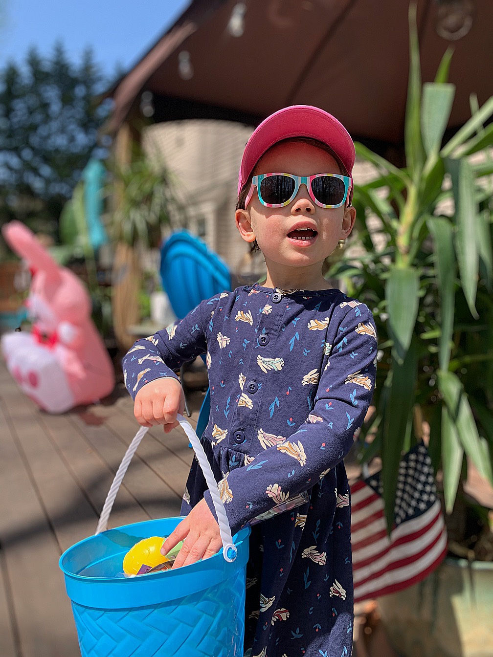 Later that afternoon, we had an egg hunt in my parents’ backyard with my cousin, Douglas, and his kids. Maelle loved finding the eggs, eating the jelly beans, and posing with the pink inflatable bunny.