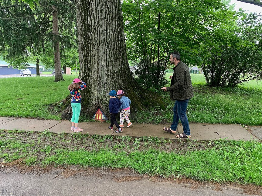 The next morning, we’d arranged to watch our friends’ kids so they could go on a little date. We took them on a walk to see the little gnome house on our street. The kiddos brought M&Ms to leave at his door!