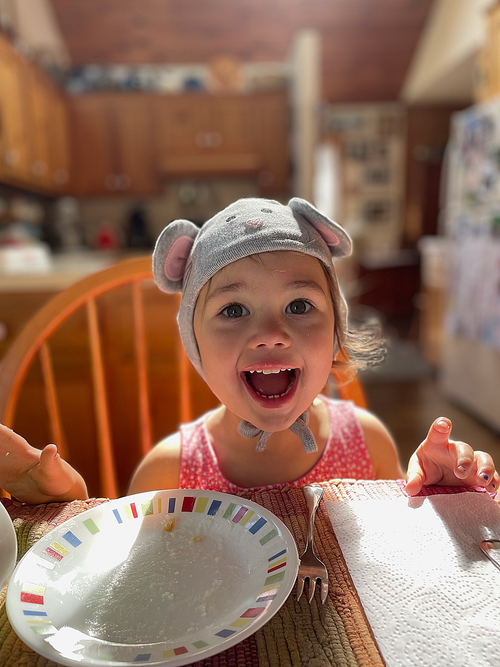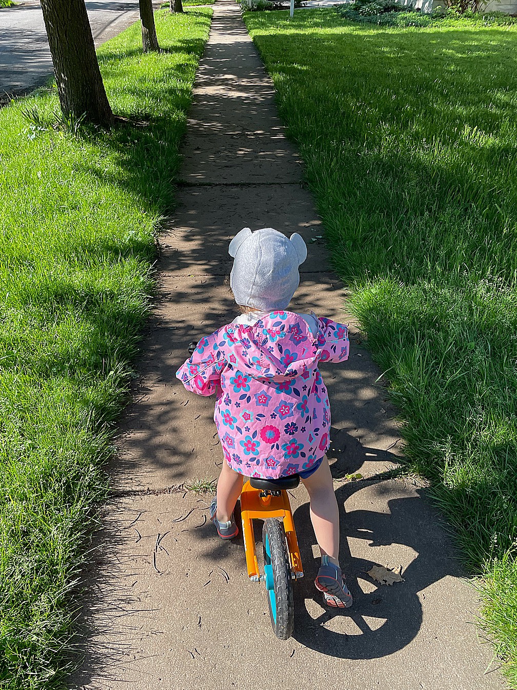 Meanwhile, back at the ranch….Maelle was living her best life, riding her balance bike all the way to the Nyes’ house…wearing a mouse hat.