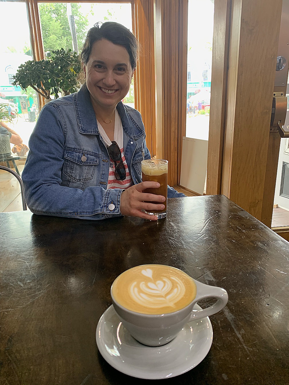 The following morning, we grabbed coffees at Heartwood, our favorite place to grab a cup of coffee while we’re in Chagrin. Emily got the Tiki iced coffee, which featured pineapple juice, and was delicious. (We both enjoyed them the day before!) I never get lattes with art on top, so that felt special.