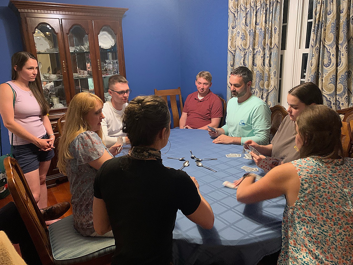 Late–VERY LATE–that same evening, after putting the kiddos to bed, Hannah (pictured below, far left, standing), Josh (seating with glasses), Andrew and I headed to an aunt (below left, blonde hair) and uncle’s house to visit with the family members who were staying there. Our game of Spoons lasted late into the evening, and we had to begin single elimination just to wrap up before 3 am.