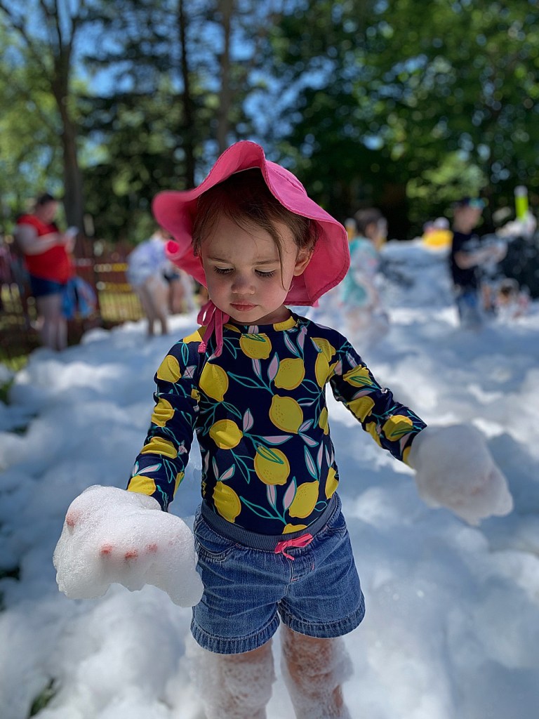 This year, the foam party in the park was back and Maelle was old enough to indulge. The local fire department creates a ‘pool’ of foam for the kids, and this year we skipped the line and simply enjoyed some overflow bubbles!