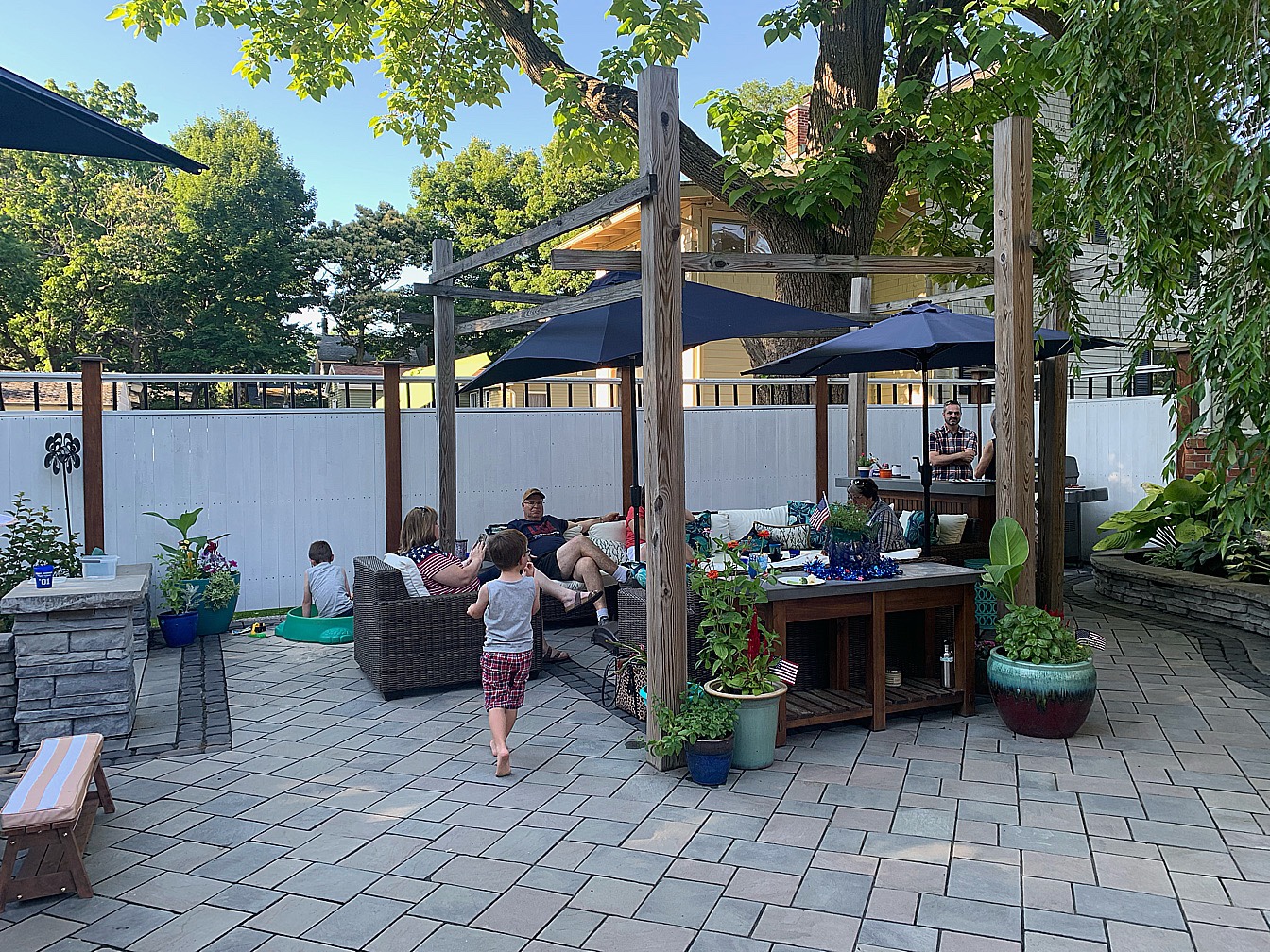 Later that evening, a few friends and family came over for a barbecue before the fireworks. You can see the new table (taller than the couch, where Andrew is standing), which has already improved the patio. Not only does it serve as a place to store items pre- and post-grill, but it’s also a landing spot for snack plates and drinks while people are chatting with the grill master. Andrew had been eyeing it for the last couple years, and I’m glad he finally pulled the trigger.