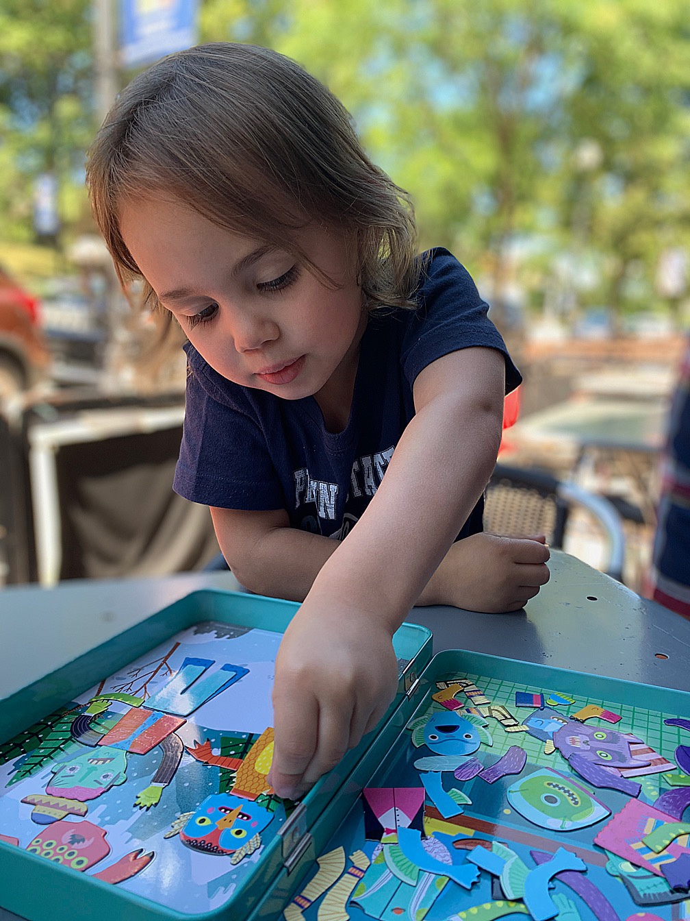 Maelle is very into monsters right now, so she chose a magnetic ‘build it’ set with a variety of monster body parts! She loves it and it’s a great toy for the car and all our long drives. She also got a guitar! It was very serendipitous; just that morning on the drive to Penn State, she saw a picture of a guitar in one of her coloring books and asked for one. A pretty random request, if I do say so myself. Well, wouldn’t you know that the toy store in State College had guitars on display when we arrived! It was a sign, and she’s been strumming it ever since. The cutest part: she says “mik-tar” instead of ‘guitar.’