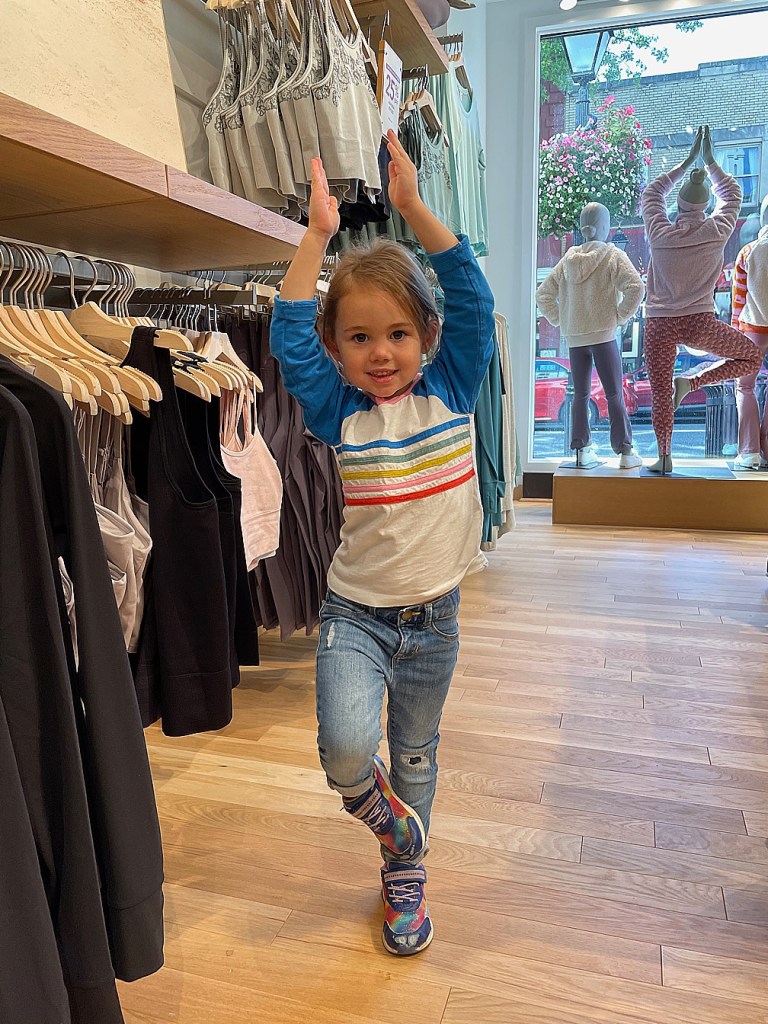 Maelle and I did our usual while Andrew was at his conference: walking around, shopping at 529 Kids Consignment, hitting the local playground and eating smoothies and avocado toast for lunch at South Block. Old Town has an Athleta now–one of my favorite stores–and Maelle practiced her ‘tree’ pose, just like the kids in the window.