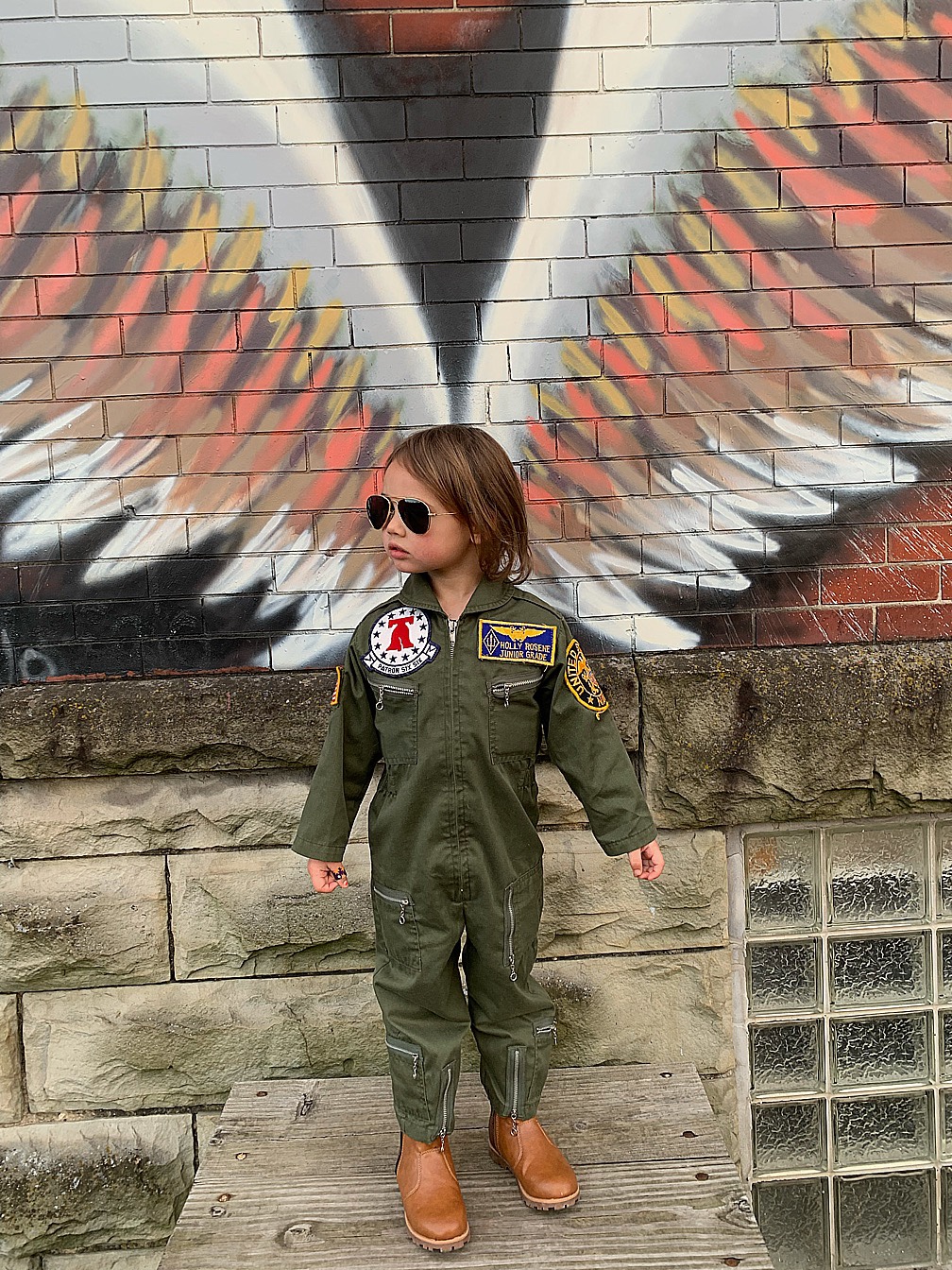 This year, my old flight suit (that my father made about 35 years ago!) fit Maelle, so she dressed in that for our friends’ Halloween party on Friday night. I found the perfect place to snap a photo: the wings painted on the outside wall at Beulah’s!