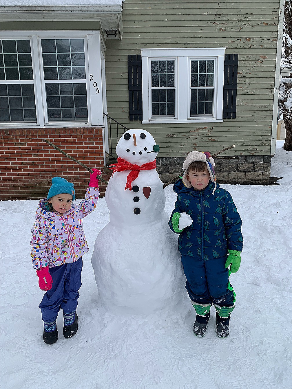 Our mid-December blizzard was a fun excuse to invite a friend over for a playdate in the snow! We built our tallest snowman yet, and the DIY snowman kit makes decorating him fun and easy. (Don’t mind the peeling paint…we’ve been waiting to do any exterior work for the house project that is going to start any *year* now…)