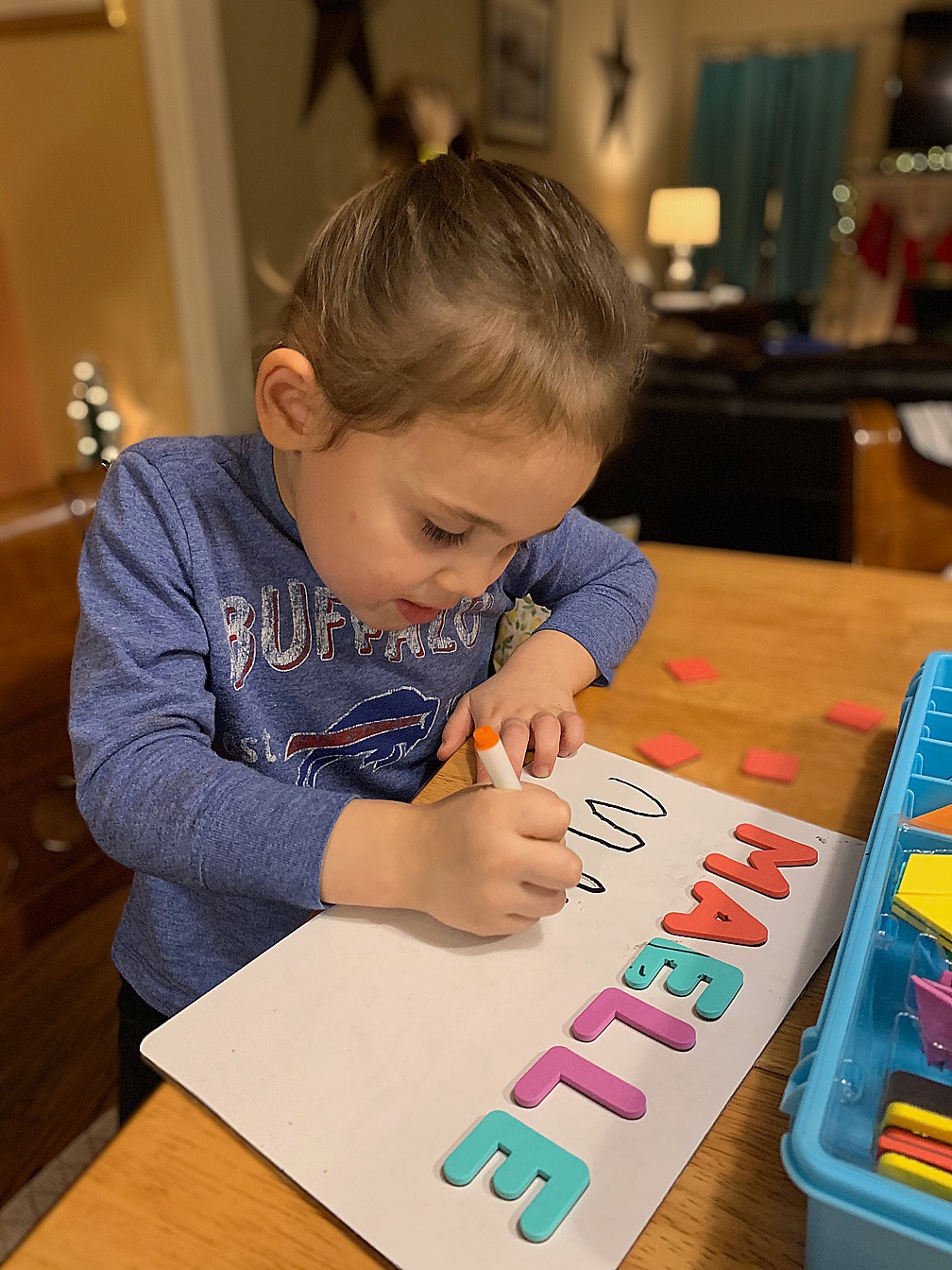Maelle is really enjoying learning to write her letters, and this kit with a dry-erase board and magnetic foam letters is great!