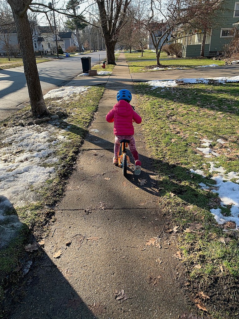 We’ve had some unseasonably nice weather here, so we got to walk/ride to ninja gym twice in a row! The first time was a little wet and our shoes got super muddy, so I got smart the next week and brought Maelle an extra pair. Of course, that day it was totally dry and we didn’t need them, but that’s how it goes, right?!