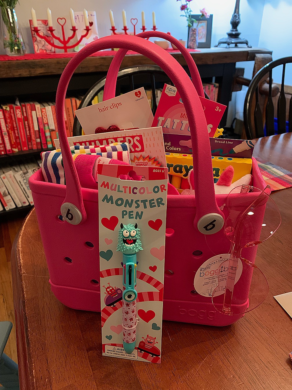 I stuffed her bag with Target dollar finds, as well as a pink striped pair of jams that I’d been saving for her in the ‘too big’ box. Of course, out of all the items, I think the heart hair clips and temporary tattoos were her favorites. We ate pink pancakes and drank pink (beet) smoothies and everyone thought it was all delicious (even Andrew!).