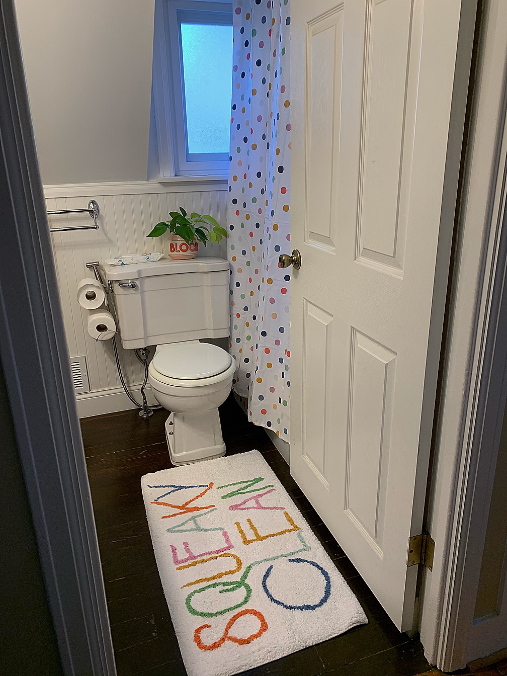 I’ve been wanting to turn our upstairs hall bathroom, used primarily by overnight guests and infrequently by us, into more of a kid’s bathroom for awhile now. In fact, as soon as found out we were pregnant, I was eyeing these polka-dot accessories from Target! However, for the longest time, the bathroom was supposed to get bigger as part of a second-story dormer in our upcoming house project (hopefully more on that VERY soon), but due to budget constraints, we’ve had to cut it out.