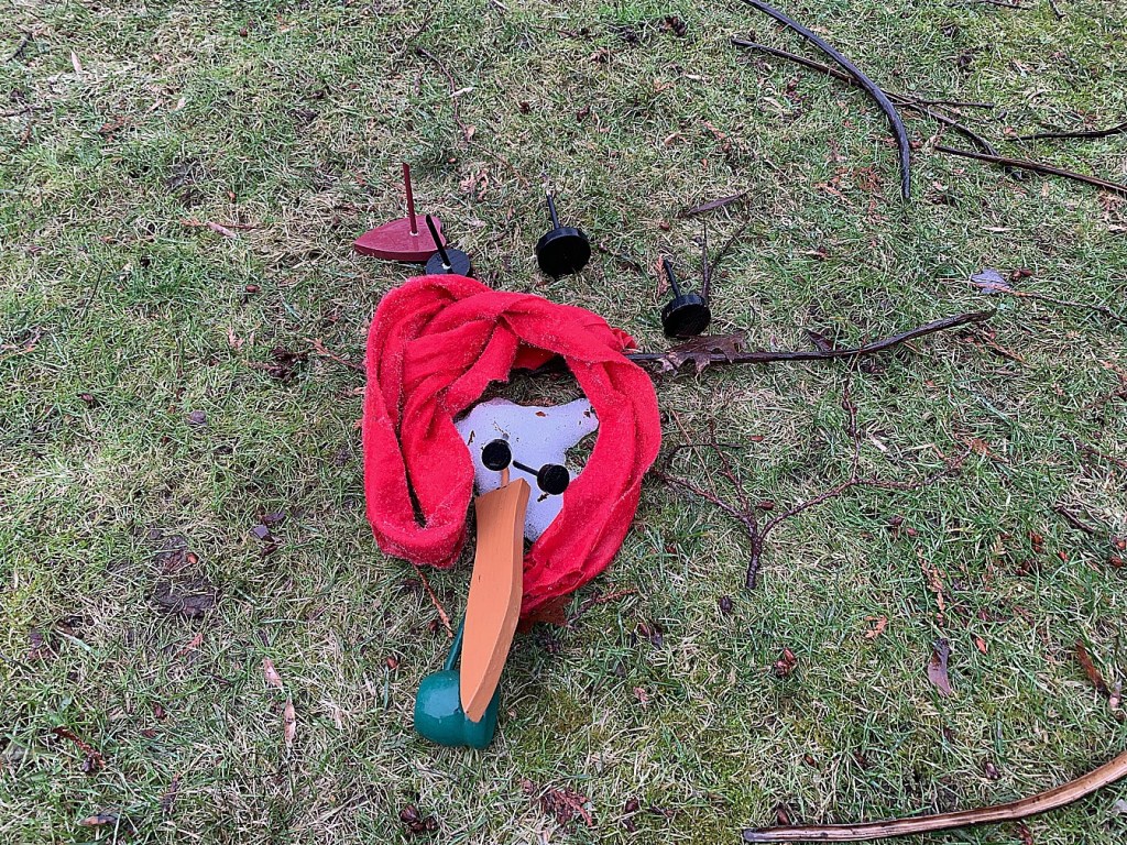 We’d gotten snow earlier in the week, and by Friday, it was almost gone. I had to snap a photo of our melted snowman and the pile of his accessories!