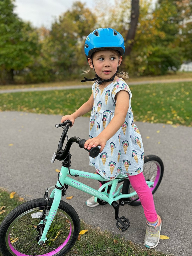 Maelle started out on a hand-me-down bike from another kid, but I sprang for a Guardian bike after my bestie raved about them. Maelle was already able to ride, but the lighter frame of the new bike made getting herself started so much easier. We have a paved track across the street from our house, which made teaching her to ride so much easier. So excited for family bike rides next summer!