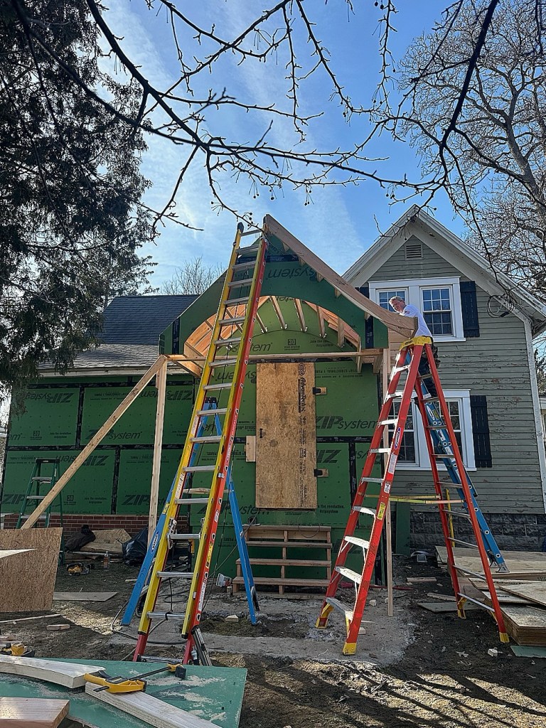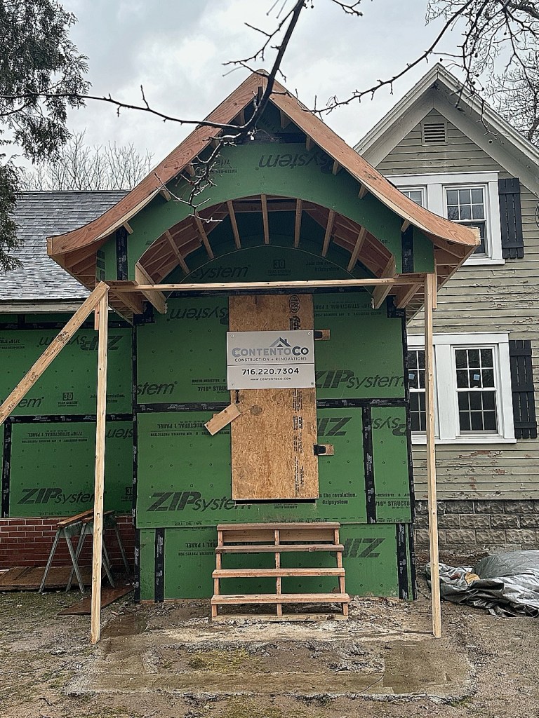 Here she is! A gable roof with double curves over a small porch ahead of the new vestibule. Our front doors will be where the plywood door is now. If you recall from the overview post, we originally (and for a long time) had a barrel curved roof over this porch in the design. Andrew and the architect loved it, but my dislike for it grew and grew. As soon as the architect came up with this gable and curves, I thought it was perfect.