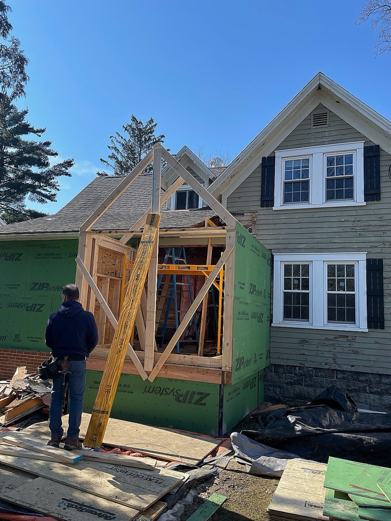 After the contractors demoed and reframed the porch, they began framing the new entry way into our house. It includes a vestibule and covered porch. Also, can you believe this photo was taken in late February?! It was a beautiful day.