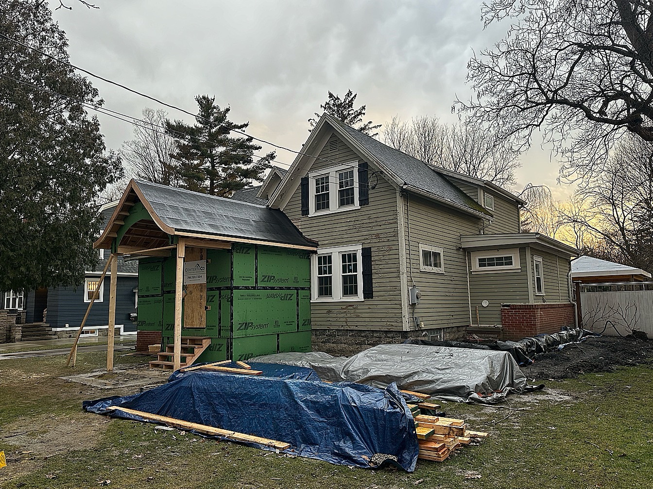 After the contractors demoed and reframed the porch, they began framing the new entry way into our house. It includes a vestibule and covered porch. Also, can you believe this photo was taken in late February?! It was a beautiful day.
