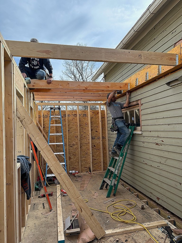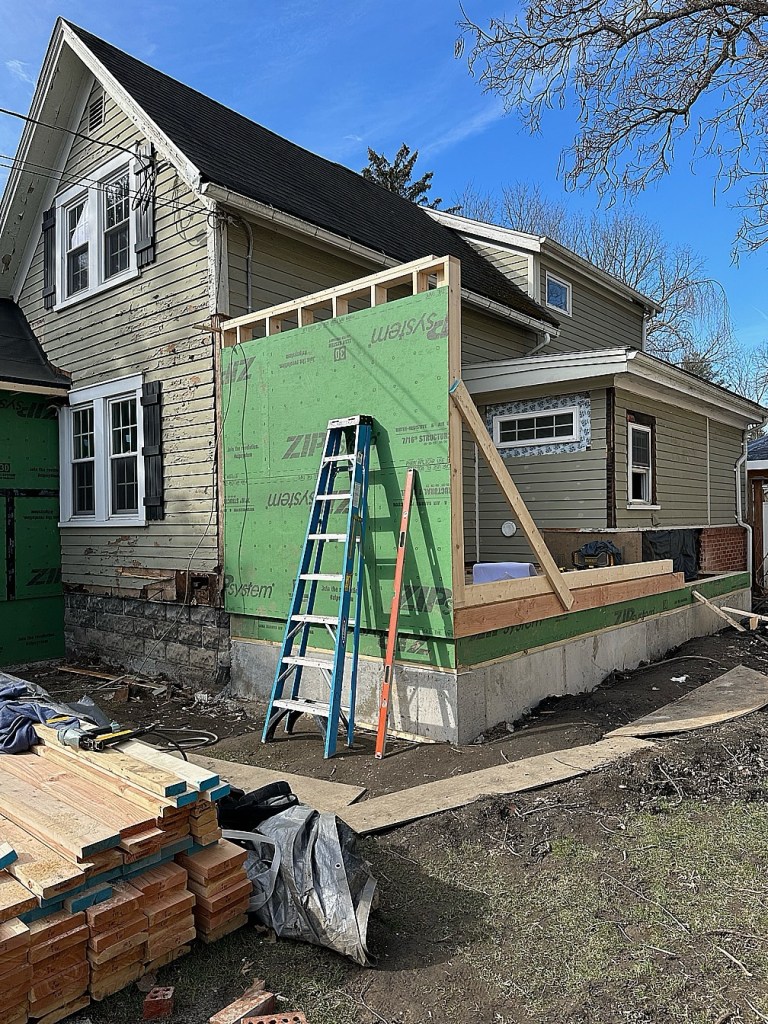 There’s a window! (Or rather, a hole for a window.) You can see how the addition doesn’t go all the way to the back of the house. However, that space will get a new metal roof that’s angled in this project Right now it’s a flat shingled roof in rough shape. Plus, that metal roof will look really nice next to the pergola in the backyard…that will get a metal roof eventually.