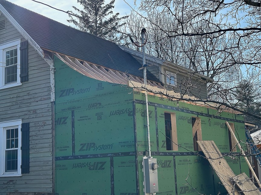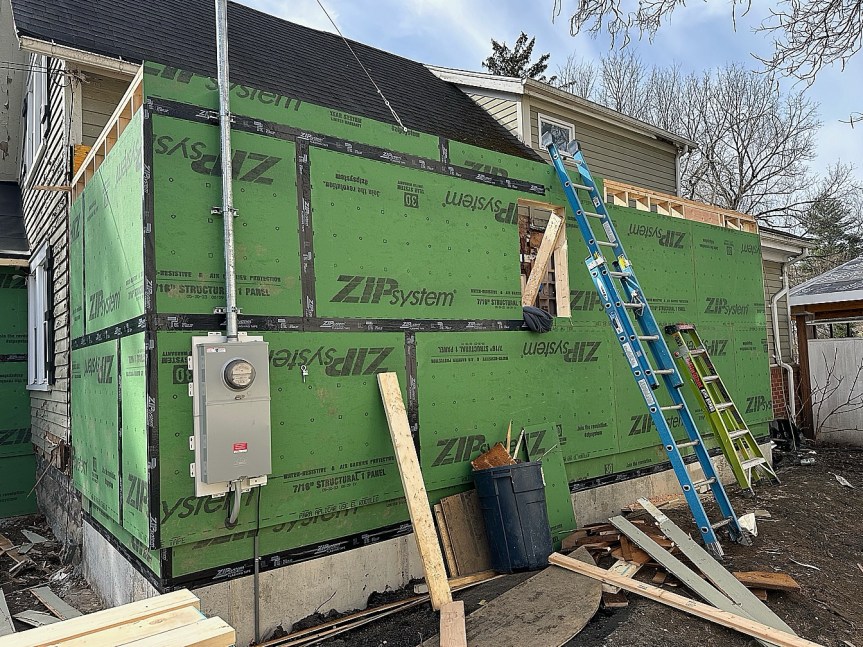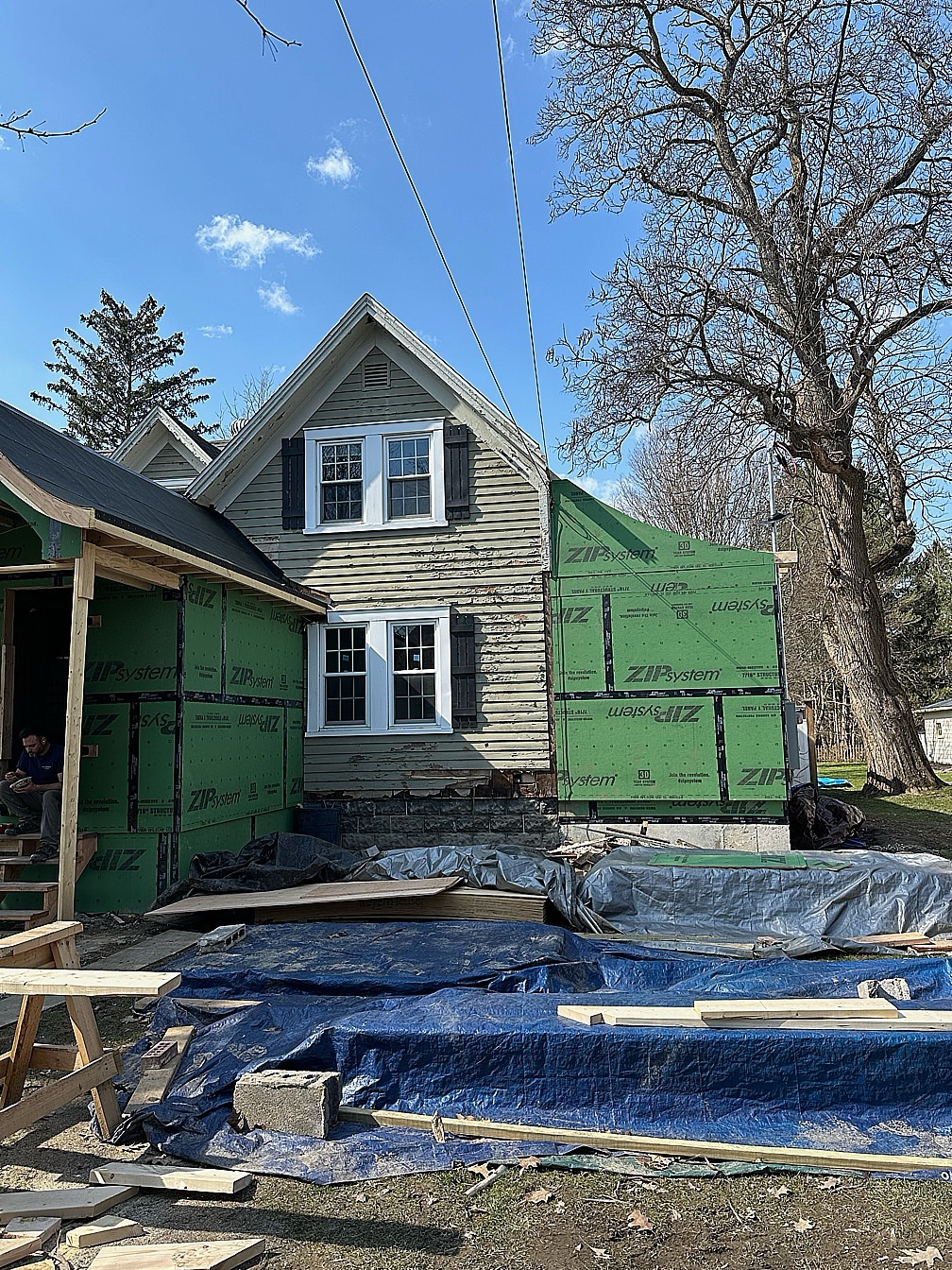 Here’s a closer view of how they created that curved roof. Setting the curve was a group effort; our contractor, Chris, and our main carpenter, Justin, worked with both of us for more than an hour to get the curve just right. We got creative and ended up using a chain from Chris’s truck to help. They hung it from the top shingled portion of the existing roof over to the lower end, to make sure we got a true curve but also that it didn’t flatten out at the lower end. Then, they traced that onto zip wall (the green board), and used that as a template for the new framing. We were appreciative that they wanted our input and went the extra mile to make sure it was right.