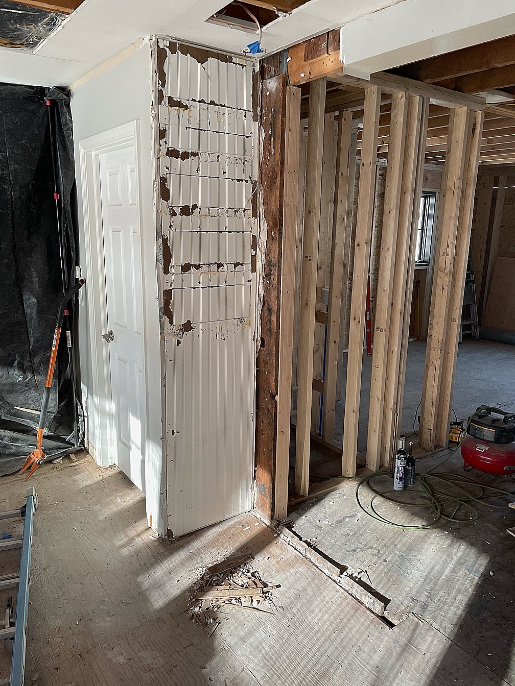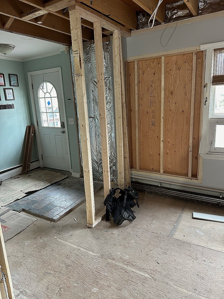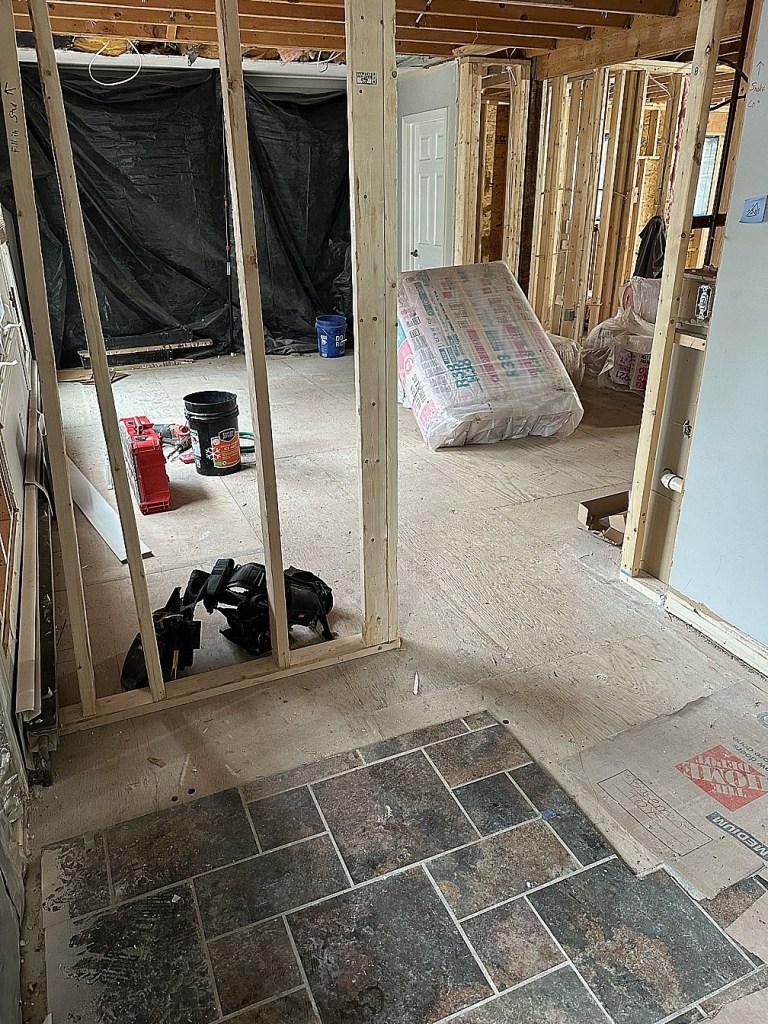 You can see where the window had been (plywood), and where the old coat closet sat (tile). The back entry really wasn’t very large at all, and because it will become our main entry to the house after the project, we really wanted to make that a more functional space. Our goals were to widen the entry space, as well as the ‘hall’ as you walk from the back into the living room. You can see the new framed wall is further into the living room, and doesn’t extend as far into the ‘hall’ as the tile does (only by a few inches).