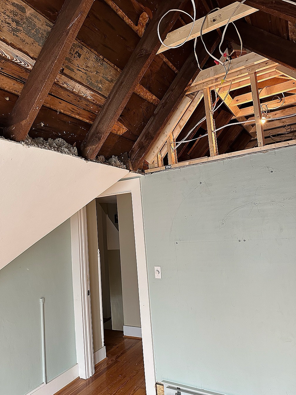 So, when they took out the ceiling in our closet (you can see through to it from the workout room, above) and revealed that it was ALSO a peak over the workout room, it was almost a no brainer. Yes, please take a little more of my money to fix this major problem AND take care of the mess. I literally could not call our contractor fast enough.