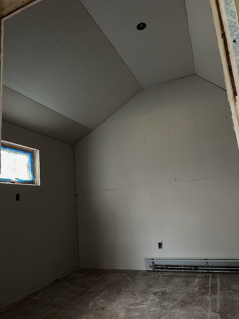 Just before we left on our London trip, our drywall was up. It’s definitely starting to look a bit more finished. Wall aren’t see-thru anymore, and you can really start imagining the rooms the way they’ll look with some furniture.