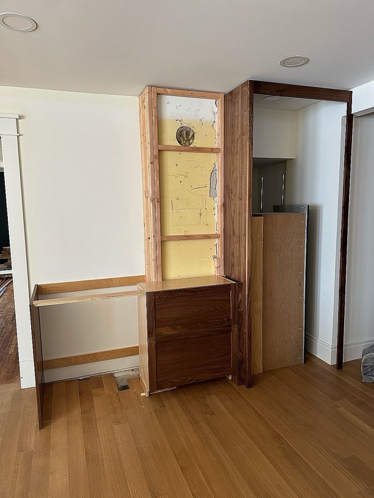 This will eventually be an entire wall of black walnut. The ‘missing’ cabinets on the left are actually refrigerated drawers, so once we get our appliances and they get hooked up, Chris will put the drawer fronts on them to look like they are cabinets. The unit directly beside it is in front of a chimney (the yellow plaster), so because we went custom, Chris was able to make a very shallow drawer and cabinet unit so that it appears to be the same depth as the refrigerated drawers next to it, but instead fits in front of the chimney. All the way to the right is our pantry (existing, it appears they’ve stored a cabinet unit inside for now), and it will have custom black walnut doors that match the cabinetry, so it all looks like one big unit all the way across.