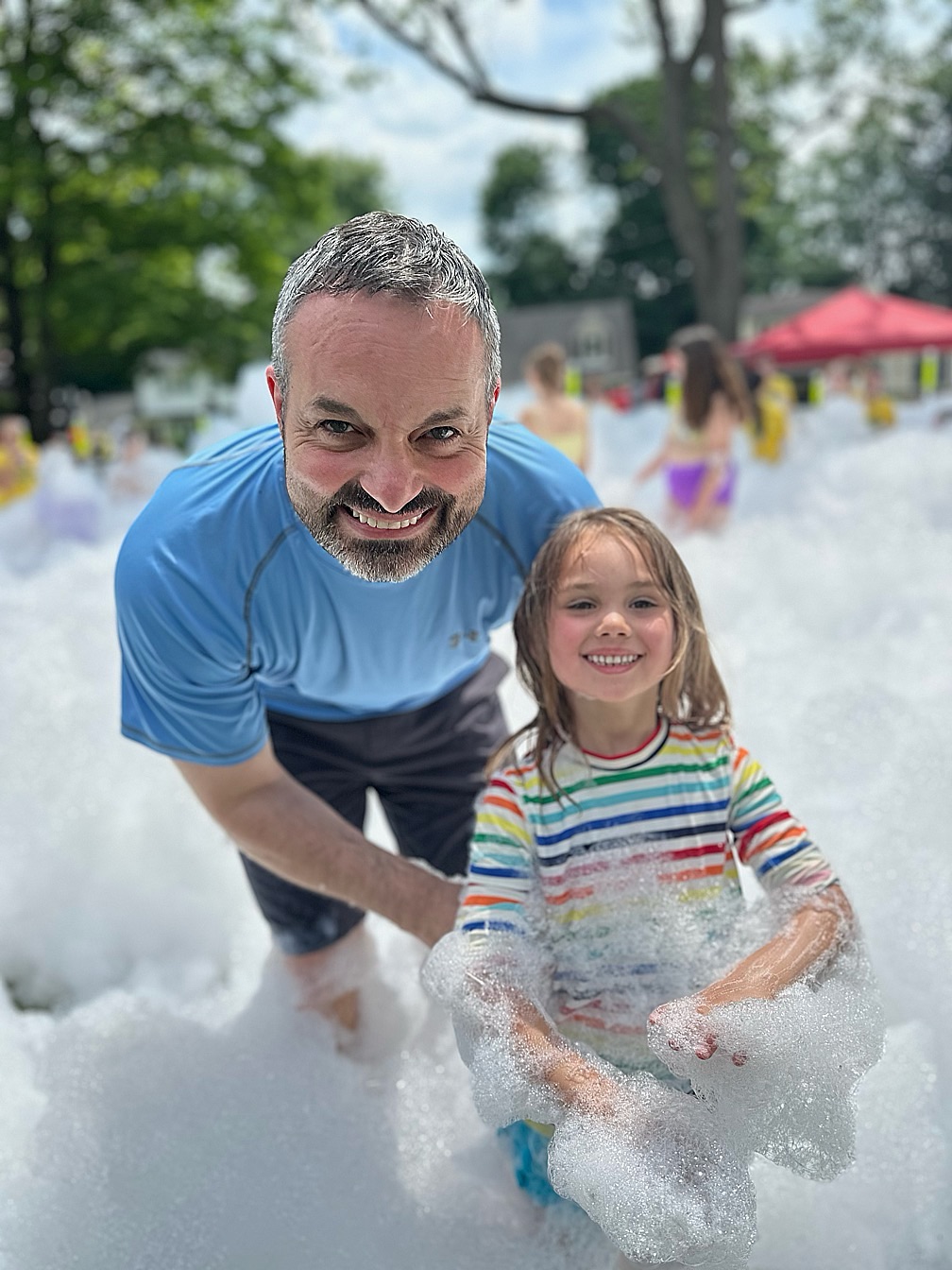 Our little village puts on a party in the park across the street in the afternoon, including a foam party (a giant pool of suds trapped inside snow fencing) and train rides for little kids. Andrew tends to get in with Maelle while I snap the photos!