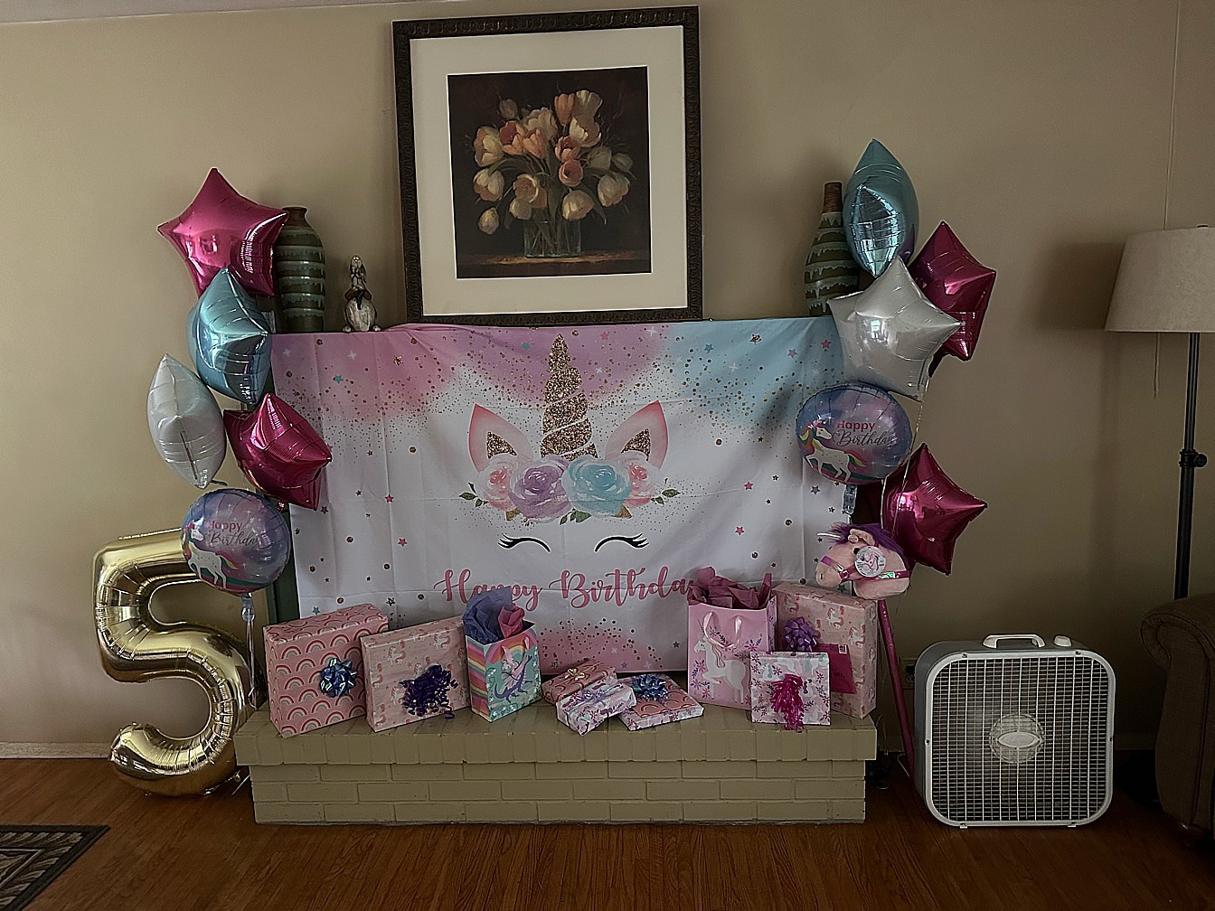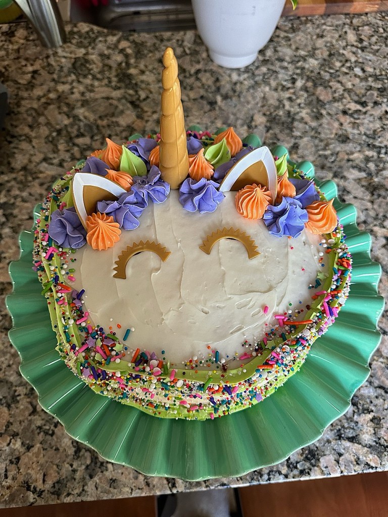 She requested a ‘pink’ cake this year, so I made a strawberry layer cake, and did my best to make it look like a unicorn. For her friend party, I bought a sheet cake and supplemented with gluten-free cupcakes (for one of our GF guests), so I saved the decorating pieces from the cake to re-use on her family birthday cake. The hardest part: searching boxes in our basement to find my cake stand!