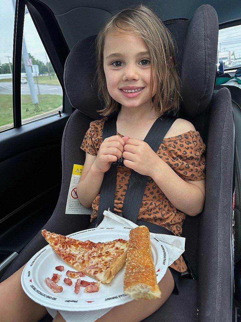 We joined Andrew on a trip to DC in late July, and–believe it or not–ordered a pizza along the way for dinner. They gave us paper plates and napkins, and it worked out surprisingly well. Not a veggie in sight, but oh well.