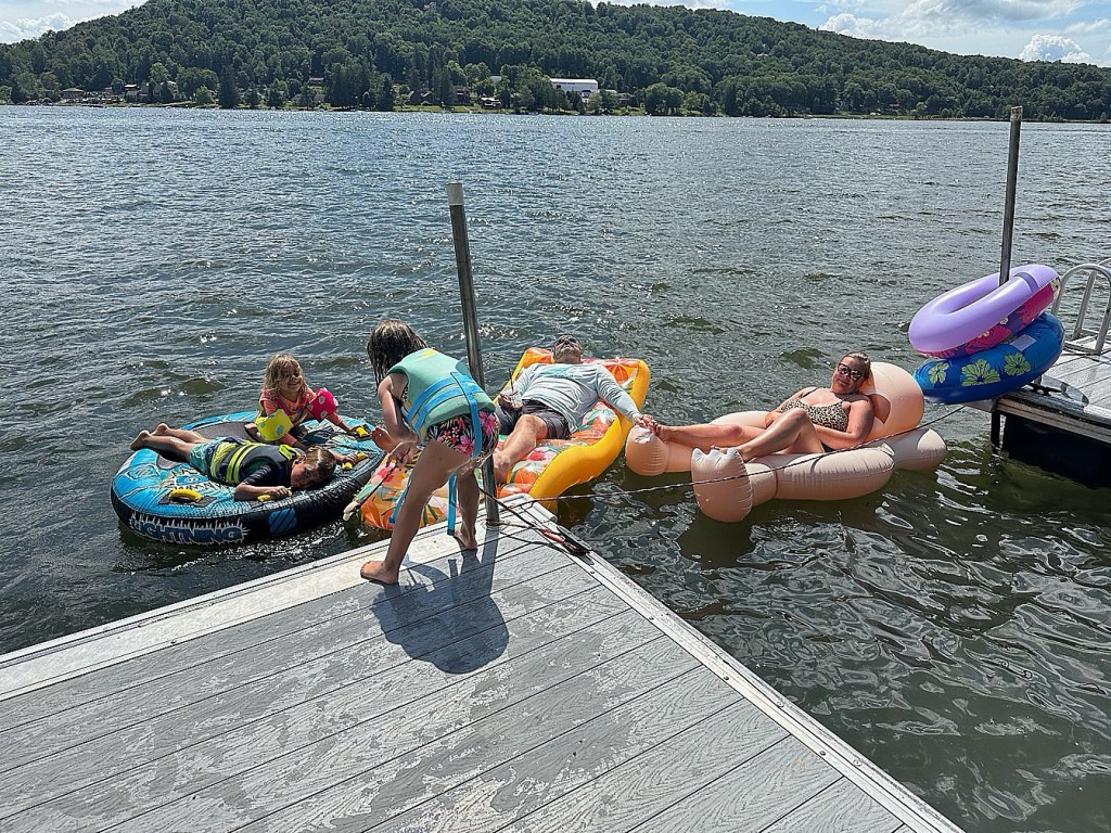The grown-ups’ favorite activity is tying the large inflatables together and floating near the dock. One blew away this year and I had to swim after it–quite a workout! Speaking of swimming; I did make it across the lake this year. I feel like I have to swim across at least once to prove to myself that I can do it.