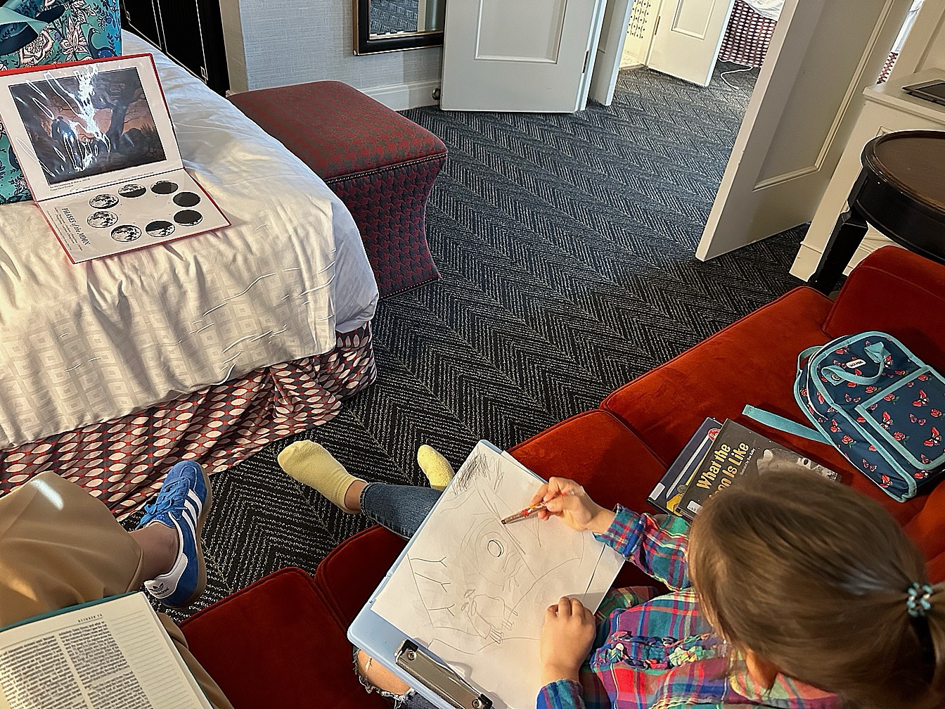 We even fit in some school time in our hotel room. We were learning the phases of the moon, and one of the activities includes studying a famous painting and sketching your own version. Looks like I was catching up on my daily Bible reading while Maelle was drawing.