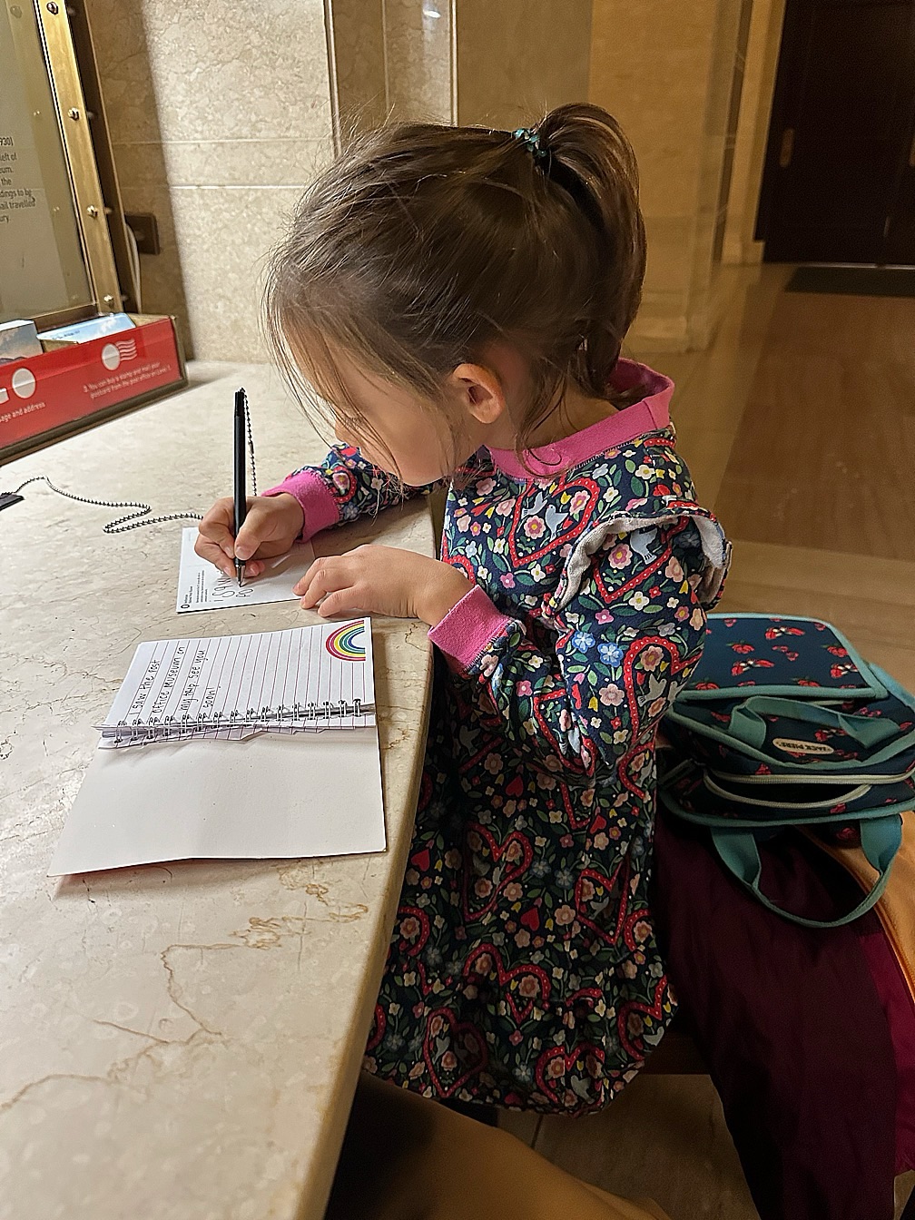 One of the things you can do while at the museum is write and mail a postcard! Maelle chose a few recipients, and we went downstairs to the post office to purchase stamps and send them on their way. I incorporate letter-writing each week into our homeschool as a way for Maelle to do copy work, and we call it ‘Mail Monday.’